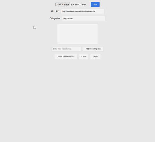 UI と動作の例はこんな感じです。ファイルを選択して、API の URL と検出したいカテゴリを入れて Run ボタンを押すと、そのカテゴリに応じた検出枠が出力されます。