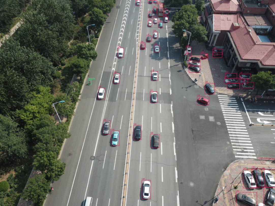次に、空撮した画像の検出を試してみます。クラスは car, bus, truck, bicycle