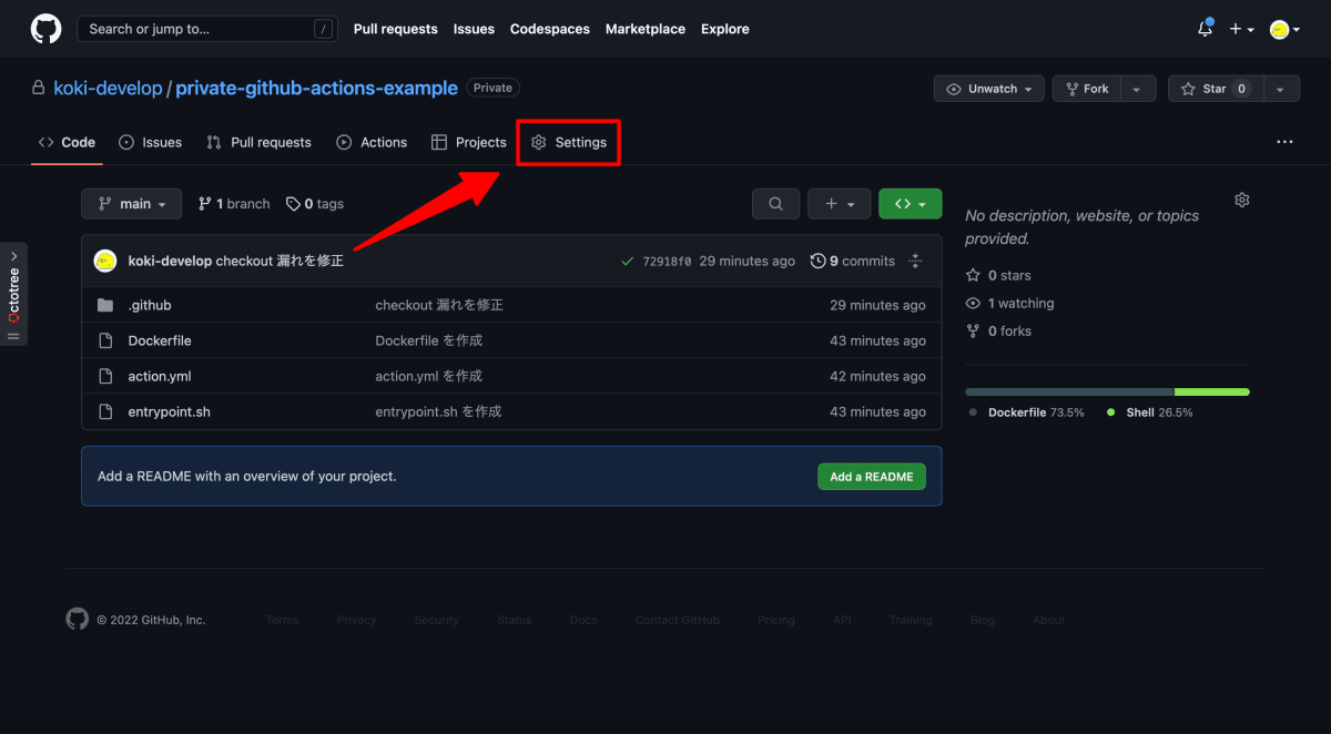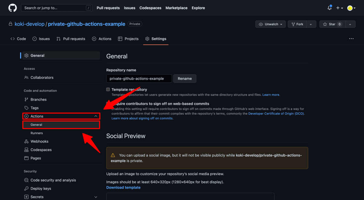 というプライベートリポジトリを作成して、 private-github-actions-example