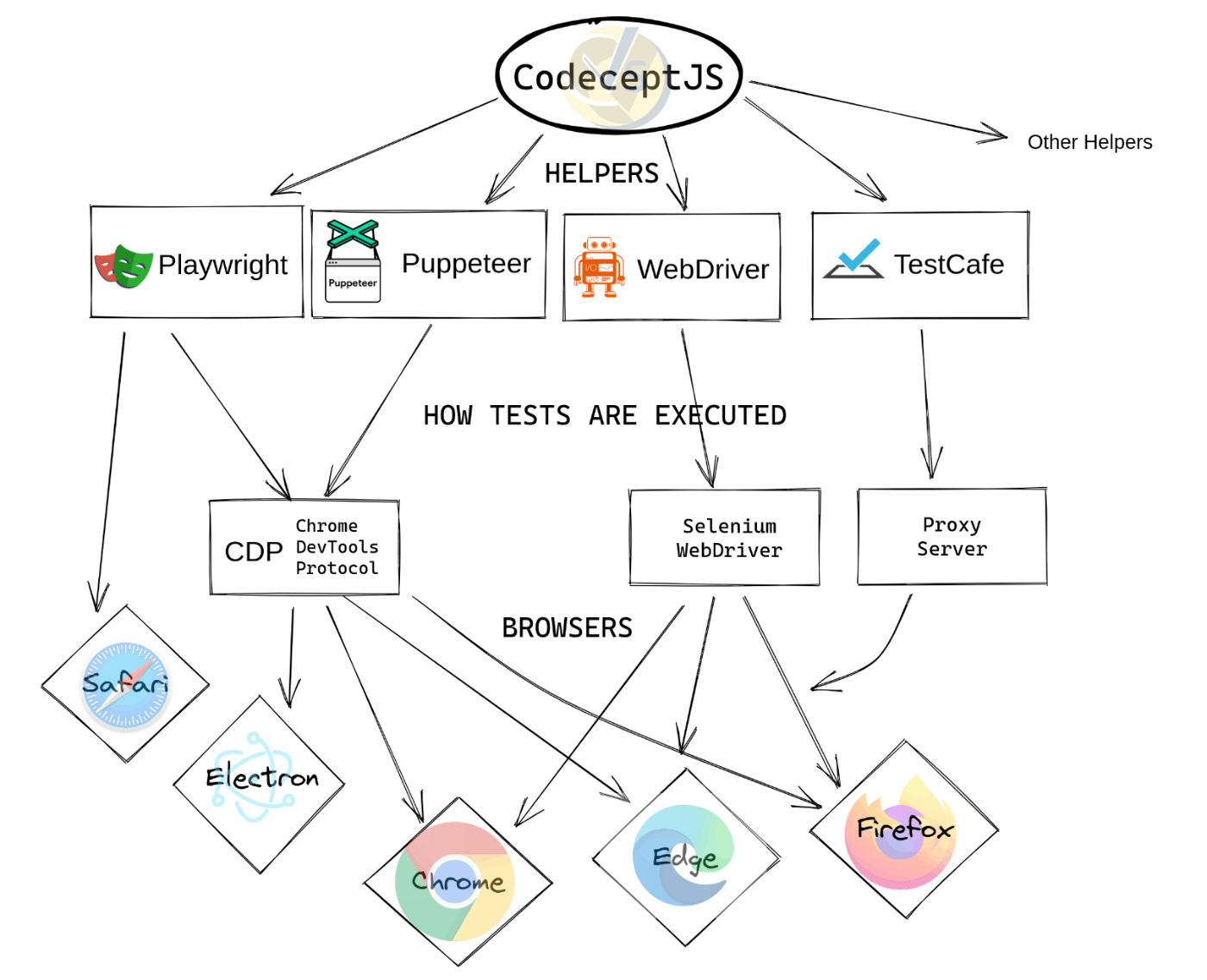 CodeceptJSはE2Eテストのフレームワークです。人が読むのに近い(Gherkinスタイル)でテストシナリオを記述できます。Webドライバーは持っておらず、PlaywrightやSeleniumなどのブラウザを操作するHelperを持っていません。それが故に色々なHelperツールと組み合わせる事ができます。