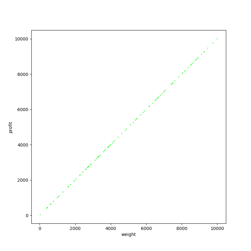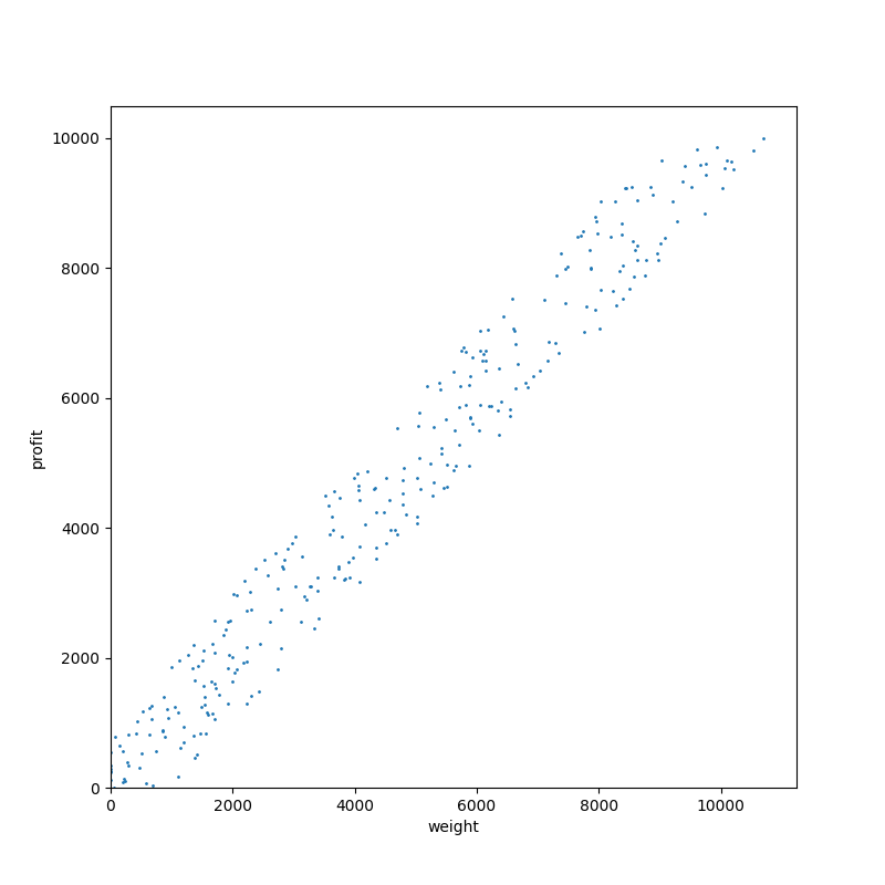 つまり、「価値は重さ+10」となっています。散布図でいうと斜め 45 度の直線をちょっとだけ上へ持ち上げた直線になっていたわけです。これをやられると何がつらいかというと、「小さな(重さの小さい)アイテムほど費用対効果が高い」ということになってしまうのです。こうなると例えば貪欲法で費用対効果が大きい順に入れていったとき、段々アイテムが大きくなっていきます。そして最終的には容量の余りが大きくなってしまいがちで、良い下界値とならなくなってしまうのです。