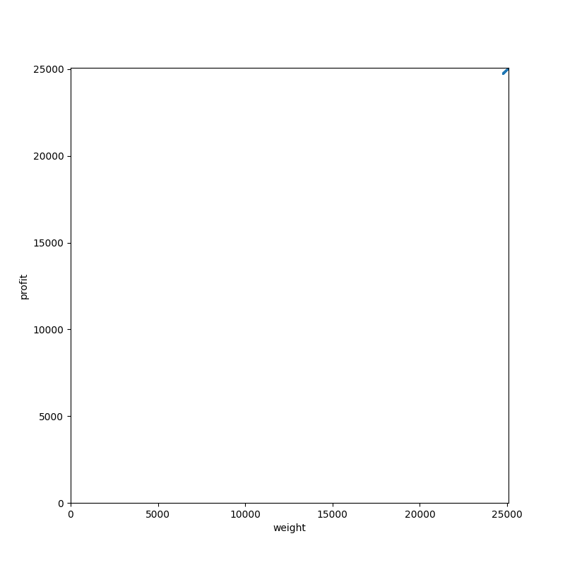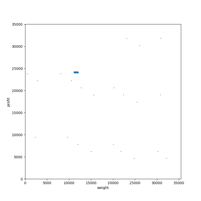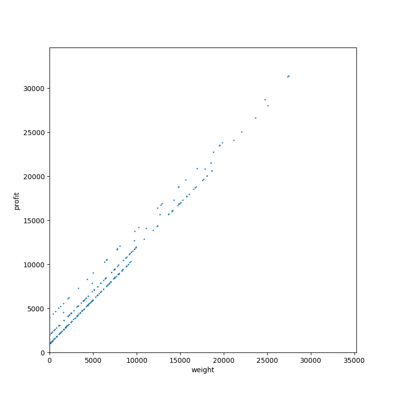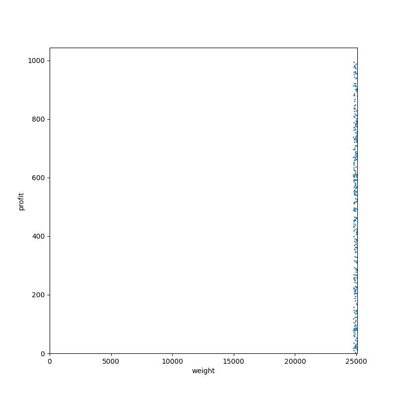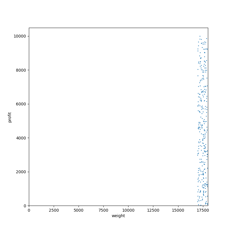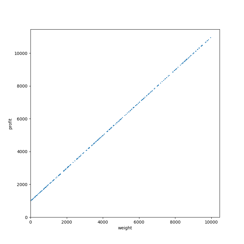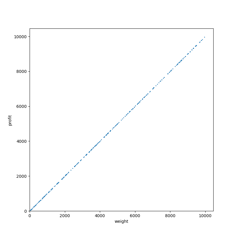 タイプ 7。分枝限定法にとって微妙に嫌らしいタイプの部分和問題です。散布図だと分からないですが、すべてのアイテムが偶数の重さ(=価値)を持っています。それでいて容量は奇数になっています。つまり、ぴったり詰め込んで最適性が保証されるパターンは発生せず、探索をすべて終わらせるまで解けないわけです。本当に嫌らしい。