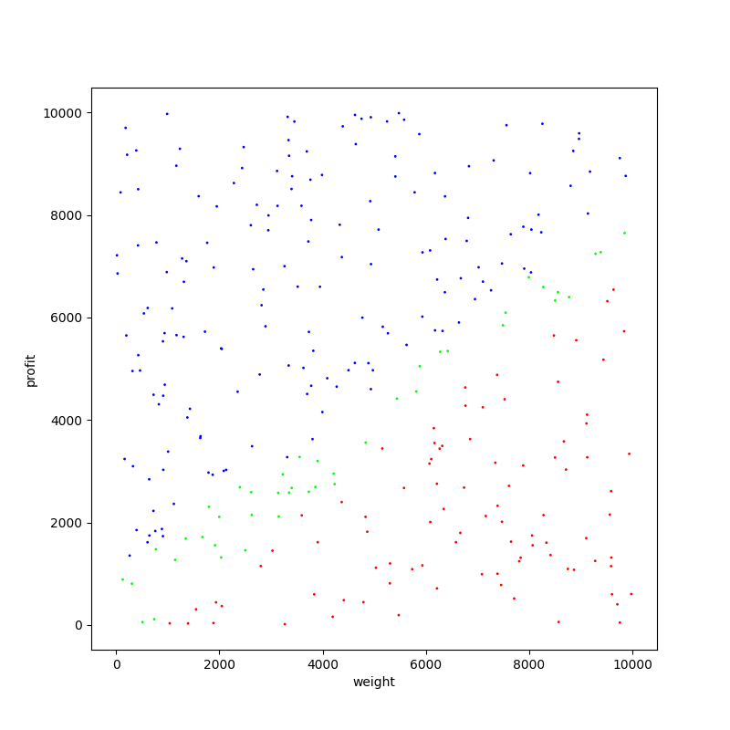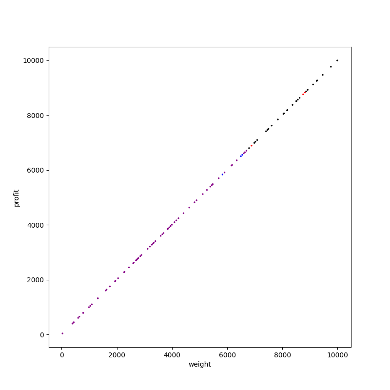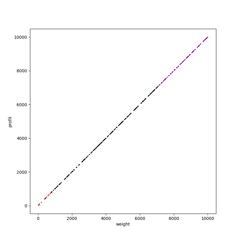 左上(費用対効果の大きいアイテム)は大体紫色、右下(費用対効果の小さいアイテム)は大体黒色になっています。赤色や青色はその境界領域にちらほら現れていますね。赤色と青色が少ないということは、貪欲法で見つかった解が最適解と比較的近かったということでもあります。