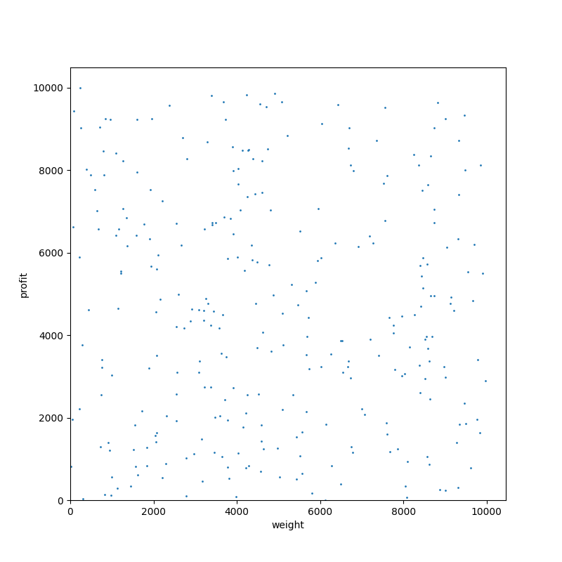 価値と容量をそれぞれランダムに選ぶということは、無相関である、ということになります。Pisinger のジェネレータだと type=1 の場合です。ランダムに選ぶ範囲を変えることでちょっと性質が変わる場合もありますが、ここでは