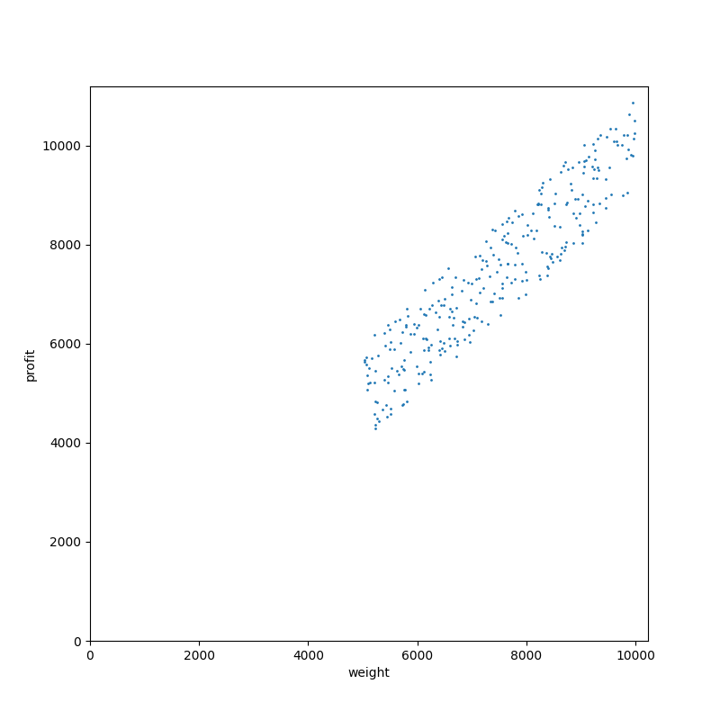 アイテム 1 個 1 個に価値と容量の 2 つの値があるので、散布図(+価値・重さのヒストグラム)で見てみましょう。