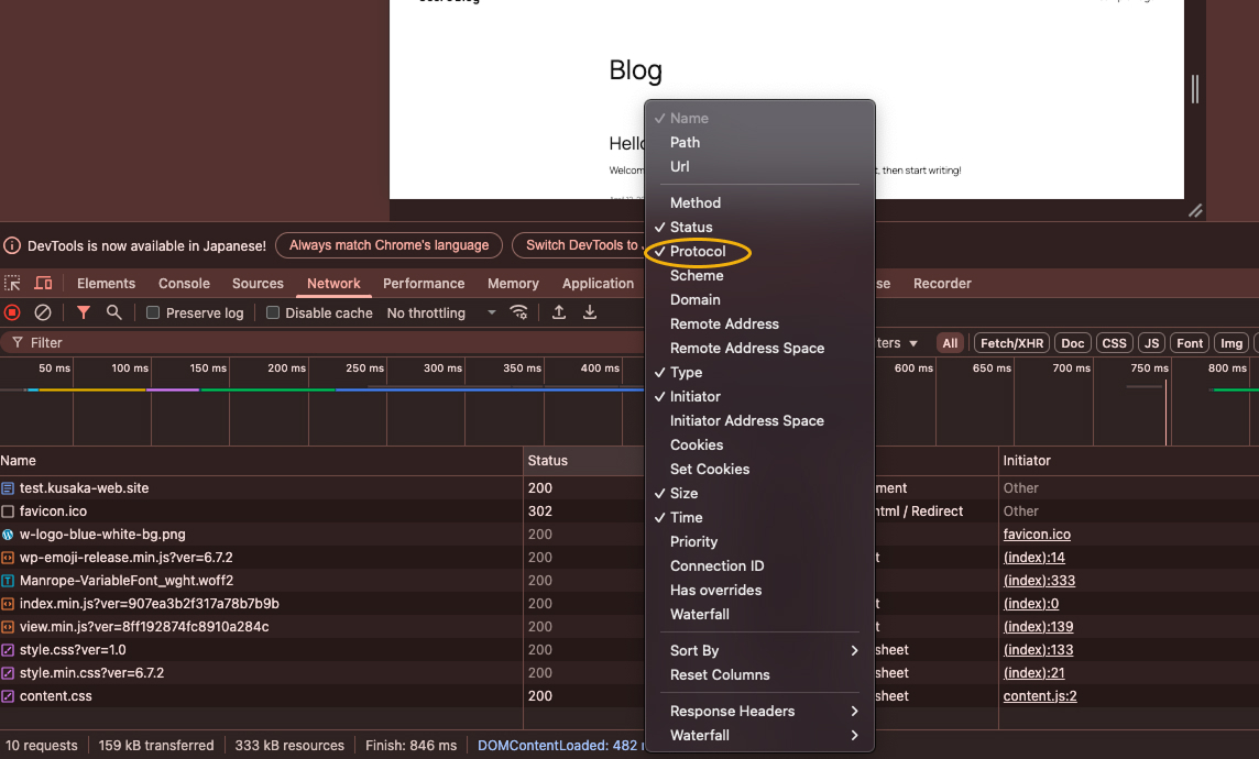もう1度、google chromeのDevToolsでhttpのバージョンを確認します。