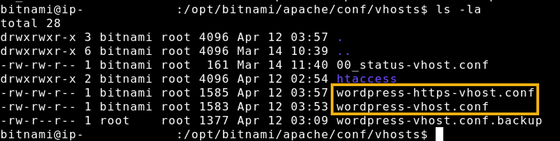 - デフォルトの Apache HTTP 仮想ホスト構成ファイル(/opt/bitnami/apache/conf/bitnami/bitnami.conf )に次のコードを追加する。