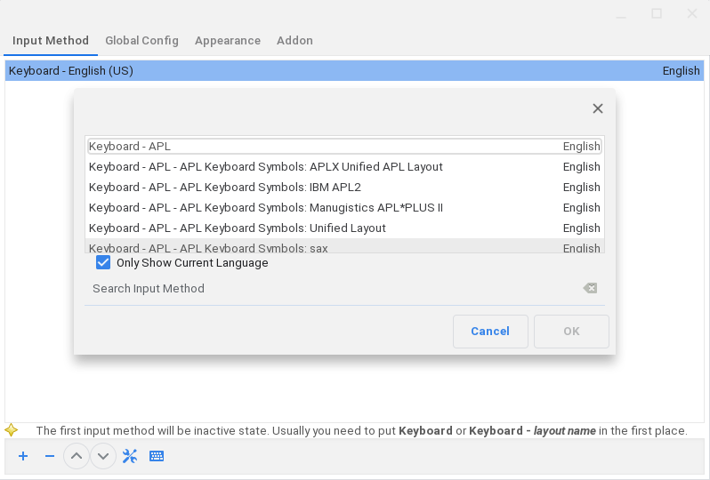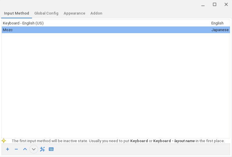 設定ツールを起動。console$ fcitx-configtool- 日本語入力用IMを追加