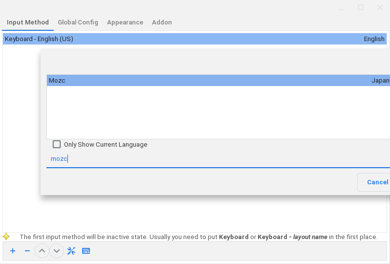 Only Show Current Languageのチェックを外してmozcで検索する。