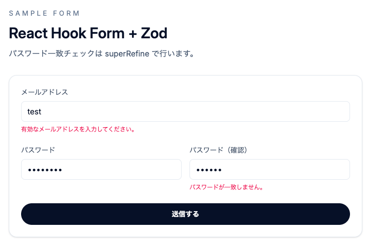 Zod において相関バリデーションを実装する場合、一般的にはrefine/superRefineを使うことになります。