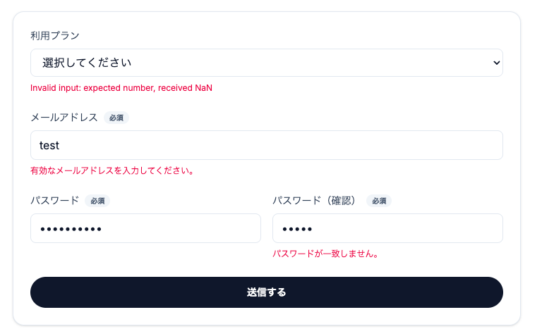 このようになりました。パスワード(確認)フィールドにエラーが表示されていない一方で、利用プランの方にはinvalid_typeなエラーが発生しています。