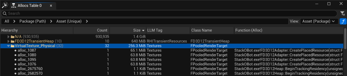 この中で63~65MB確保しているところがVirtualTextureで使用するプールテクスチャになります。(そのはず)