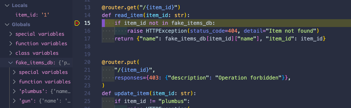 ソースコードにブレイクポイントを設定し、APIを叩いてみると、処理が一時停止し、デバッグのプレビューが確認できる