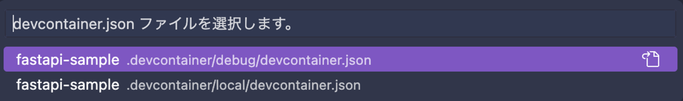 devcontainer.jsonファイルを選択できるので、debug用を選択する