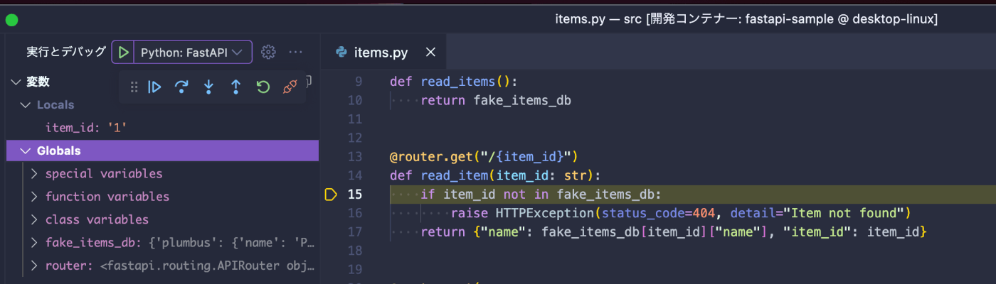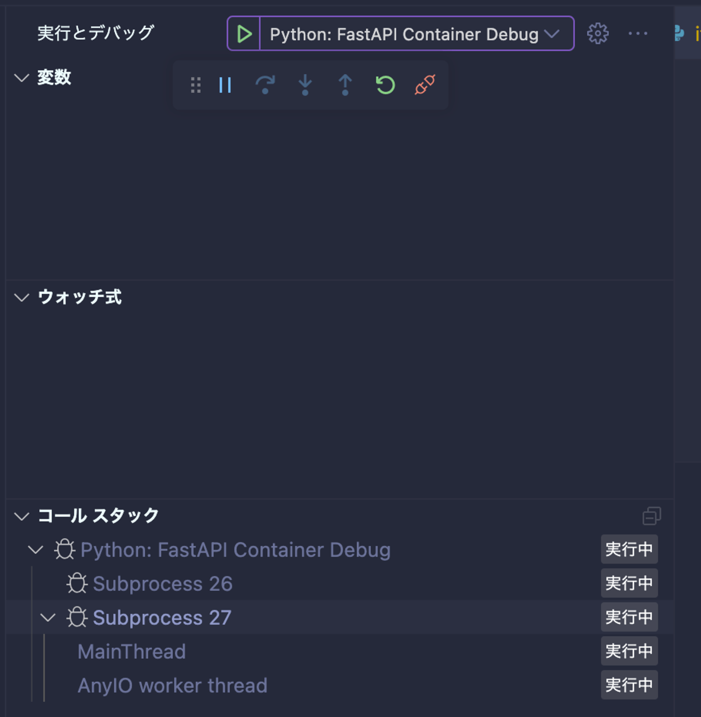 Dockerコンテナで動作するFastAPIのコードを以下のようにVSCodeでデバッグ(変数の状態を確認したり、ステップ実行したり)するための方法を記載します。
