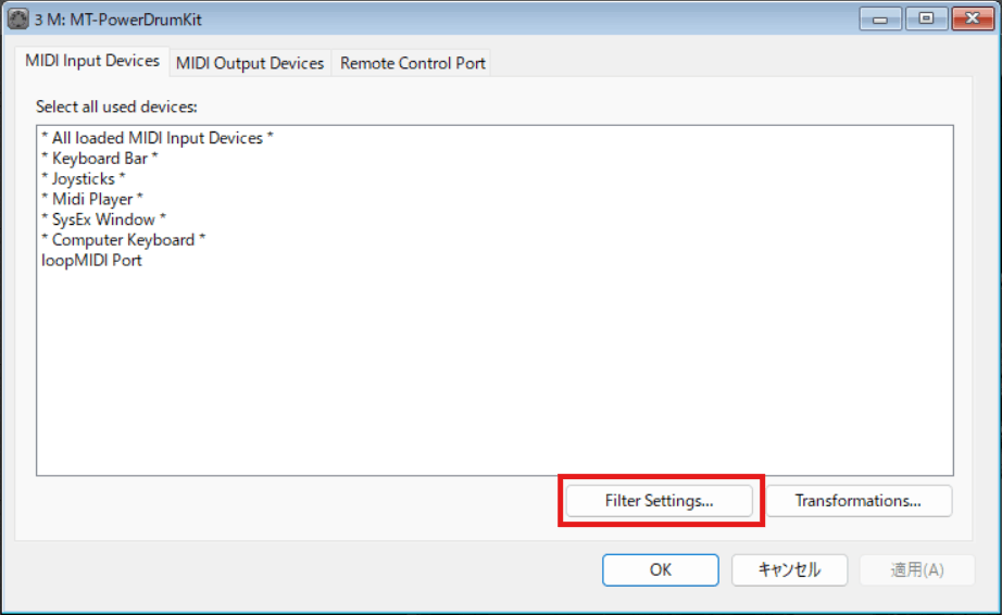 loopMIDI Portを選択します。 - MIDI Output Devicesタブ