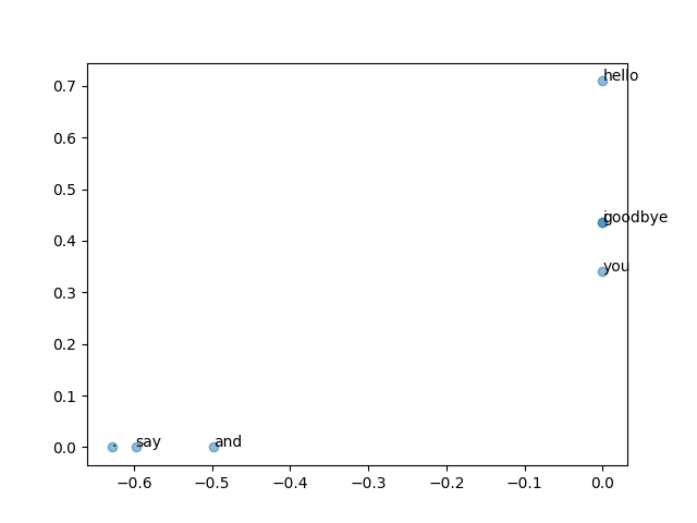 プロット図を見ると,iとyouが近くにある(iとgoodbyeが重なっている.)が,コーパスが小さい関係で微妙.