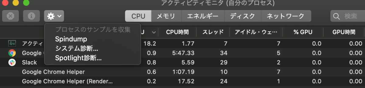アプリケーション → アクティビティモニタ → 左上歯車から