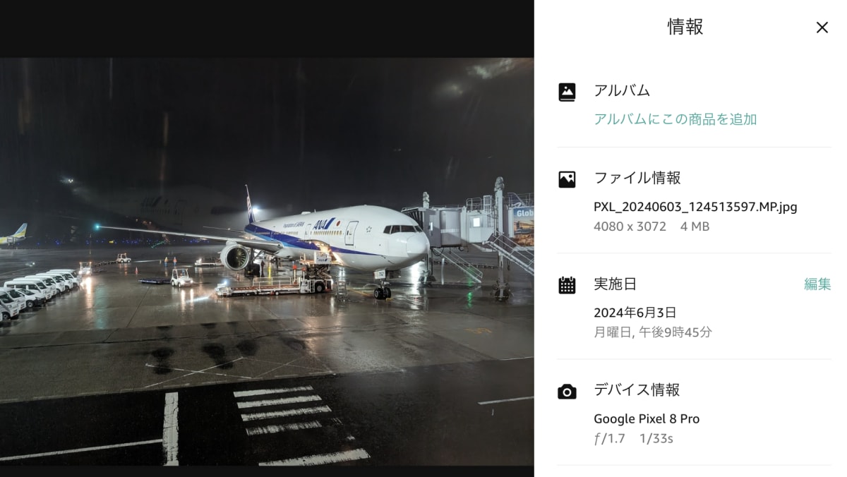Google 純正カメラアプリで撮影した写真ではきちんと撮影日が表示されます: