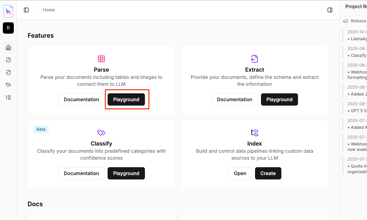 ということでLlamaCloudにログインして、LlamaParseのPlayGroundを開く。