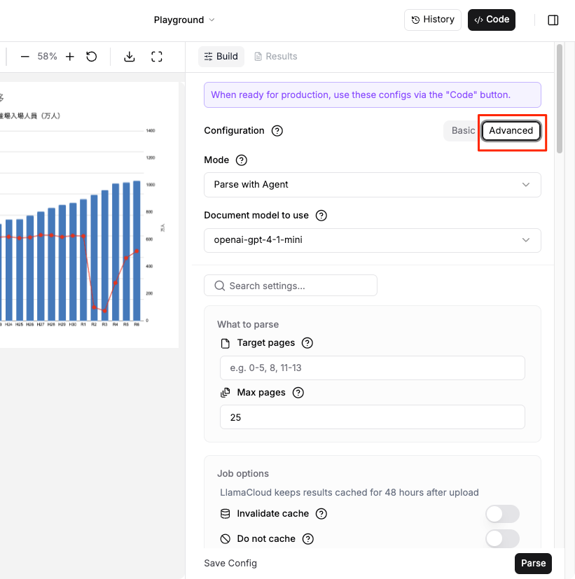 で右下の「Parse」でPDFのパースが行われる様子だが、設定が色々ある様子。まず「Basic」。こちらはどうやらいくつかの設定がプリセットされているようで、設定ごとにクレジットが異なるみたい。