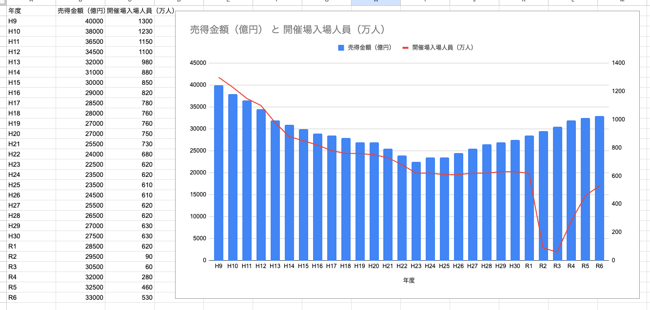 で、これの中央競馬に関するグラフのベースとなっているデータはたぶんここの「売得金額・入場人員」というPDF。こちらは昭和29年以降の数値とグラフとなっている。
