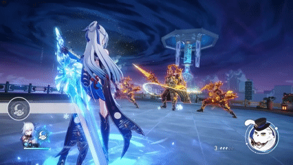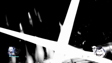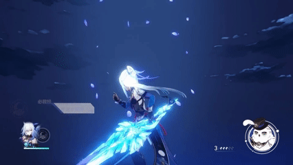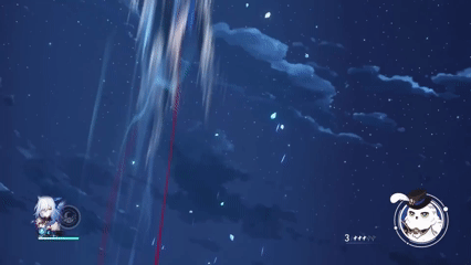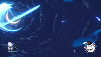👇真下から見上げたアングルで斬撃を無数に降らせるショット。背景は筒状に雲の書き割りを多層にしているような感じで、丹恒・飲月と同じものかも。飛ばす斬撃も三日月状で、月も完全に欠けさせてないですね。見上げる状態のフィックスのショットから真横のアングルにショットを替えてるように見えるのですが、一瞬だけその中間のアングルのフレームが写るので瞬間的に急激にパンダウンさせている可能性も?