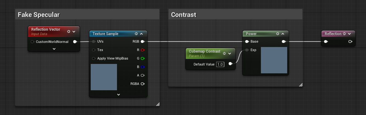 UE5 に標準で含まれているキューブマップを使用して Reflection Vector で環境マップのように貼り付けています。宝石の作例でも紹介していて、氷などでも使えますし便利ですね✨