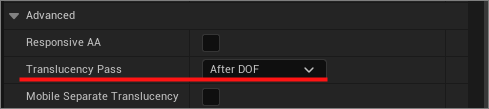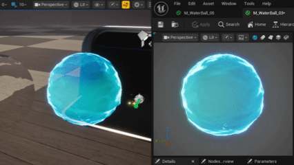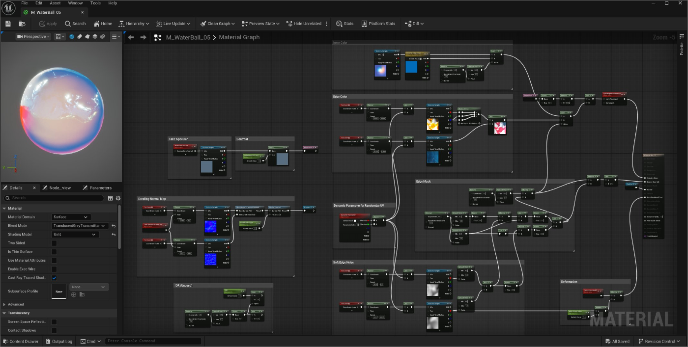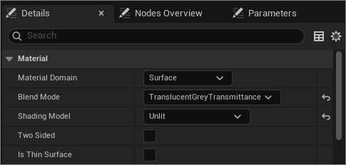 結果的にほとんど透けてない見た目ですが、試行錯誤時には透けさせたり屈折を入れたりを試していたので Blend Mode は Translucent です。Shading Model は Unlit にしていますが、実際のゲーム中でシーンの明るさに馴染ませりしたい場合は DefaultLit にした方が良いですね。