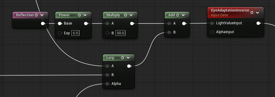 フェイクのスペキュラに対して Power でぐっとコントラストを強くしてハイライト部分が浮き上がるようにして Multiply で 50 と高い輝度を与えています。これはハイライトが特に DOF をかけた状態で奇麗に Bloom が入ってキラキラするように調整したものです。また、そこに先ほどの球体の内側の色とエッジの色とを重ね合わせて、EyeAdaptationInverse で露出対応して完成✨
