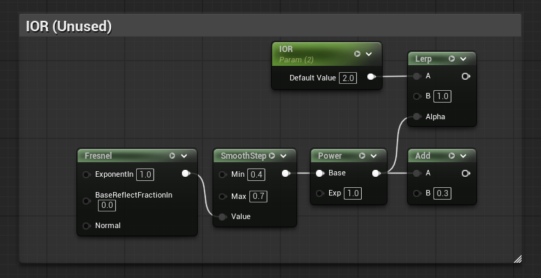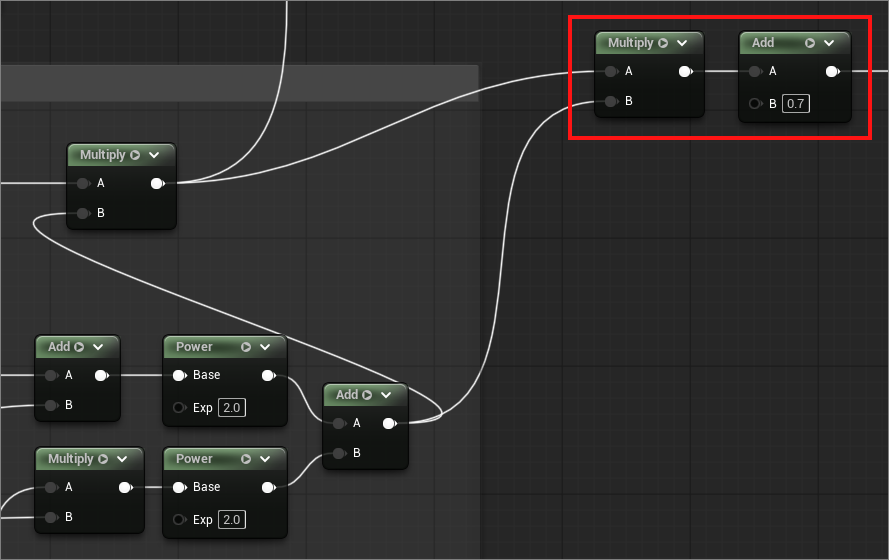 先ほどの構成に Add で 0.7 足して全体的に色を明るく底上げして Opacity に繋いでいるため、結果的にほとんど不透明に近い見た目になっています。