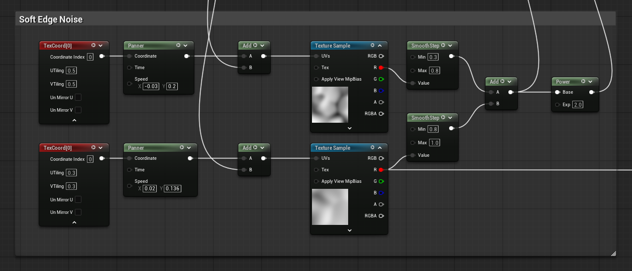 ノーマルマップと似たような感じでタイリング数とUVスクロール速度を変えた2つを Add(加算)で混ぜ合わせて、Power(累乗)でコントラストを付けた状態も別途利用しています。下段のテクスチャから右へ引っ張られている線は WPO でメッシュを変形させるのに利用しています。
