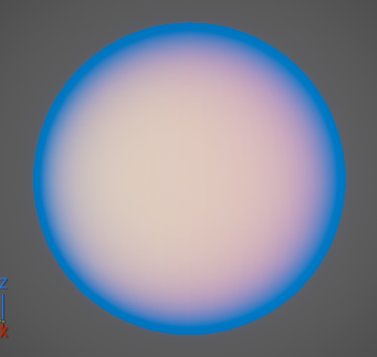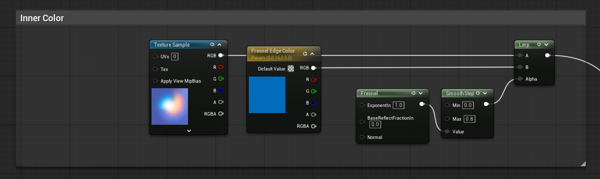 「輪郭を強めにしたエッジ + ノイズマスク」を Lerp の Alpha で利用して、球体の内側の色とエッジの色とをマスク分けして着色していますが、その内側の色はこんな感じで Fresnel の外側を暗めの青に落として中心ほど明るい色になるような感じにしています。