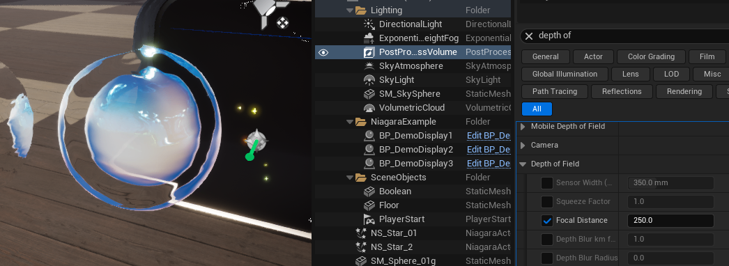 PostProcessVolume の項目 Depth of Field 内の Focal Distance に値を入れると屈折の効き具合がかなり変わってしまいます。