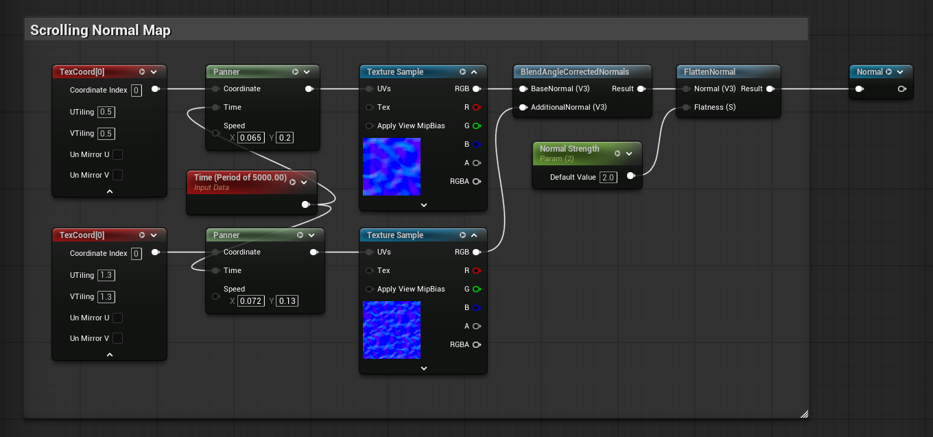 柔らかめのノーマルマップを選んでタイリングも粗めにしています。またタイリング数やUVスクロース速度を変えた2つを混ぜて複雑な波打ちに見えるようにしつつ、影響度も変えられるようにパラメータを追加しています。