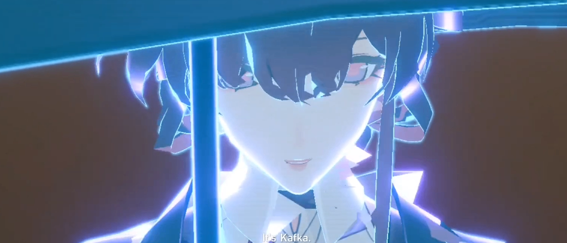 星穹列車にカフカが通信してきたシーン。真っ黒い状態から本ショットに切り替わる直前に効果音を入れることで、ホログラムが出現するような演出を省略していてうまいですね。半透明のように見える色をしていますが不透明と思われるため、出現演出を入れると VFX を重ねて誤魔化すにしてもディザが汚く見えやすいので、避けるのも良い選択に思います。