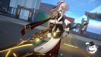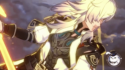 👇景元を横から捉えるショットになり武器をふるいますが、さり気なく入った集中線が良いですね。しかも高速でパラパラさせるのではなく風切りのように滑らかに遷移する集中線なのが個人的にとても良いと感じます。ちなみに景元の鎧部分だけフレネルのような黄色い反射が輪郭付近に入っていますね。