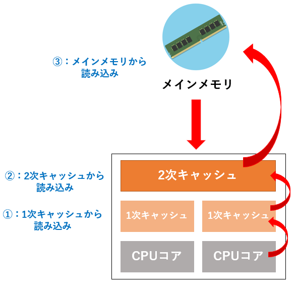 メインメモリからデータ読み込む時は、初めに1次キャッシュメモリと2次キャッシュメモリに書き込み、それからデータの読み込みを実行します。