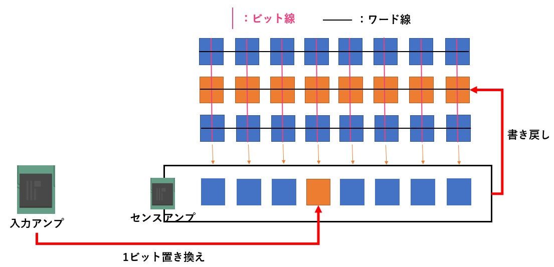 センスアンプの対象の列のビット線がオンになったら、入力アンプに保持されている1ビットがに置き換えられます。置き換えられたセンスアンプのデータをワード線で指示している対象の行に書き戻します。
