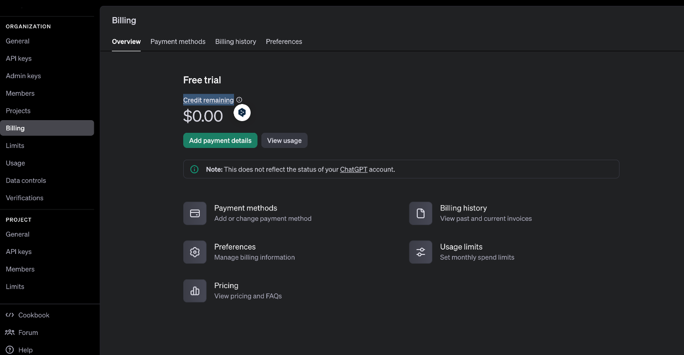 RAGではチャットモデルとユーザーの入力やドキュメントデータを数字に変換するためのモデルが必要とされます。今回はopenaiが提供しているapiでこれらのモデルを使用します。api使用には課金をする必要があるので、そのやり方をここで説明します。