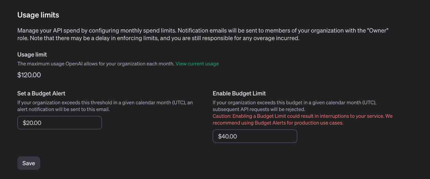 このページのUsage limitsという所で、警告金額と請求限度額を設定しSaveボタンを押します。今回は20$と40$に設定しました。(10$しかチャージしておらず、自動課金もoffにしているので問題はないと思いますが念のため)