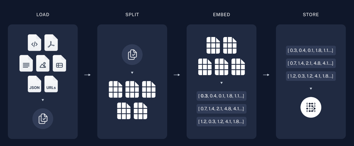 - データの取り込み(Ingesting Data):最初に、データソース(例えば、ドキュメント、ウェブページ、データベースなど)から必要な情報を取り込む処理です。取り込むデータは、テキストファイルやJSON、CSV形式など、さまざまな形態を取ることができます。