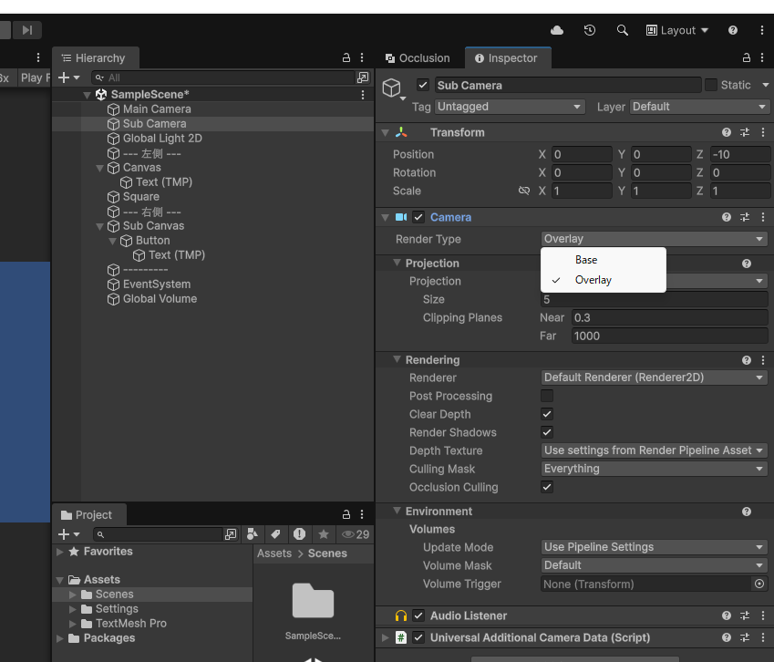 Sub Cameraを選択し、Camera > Render TypeをセレクトボックスからOverlayにしてください。