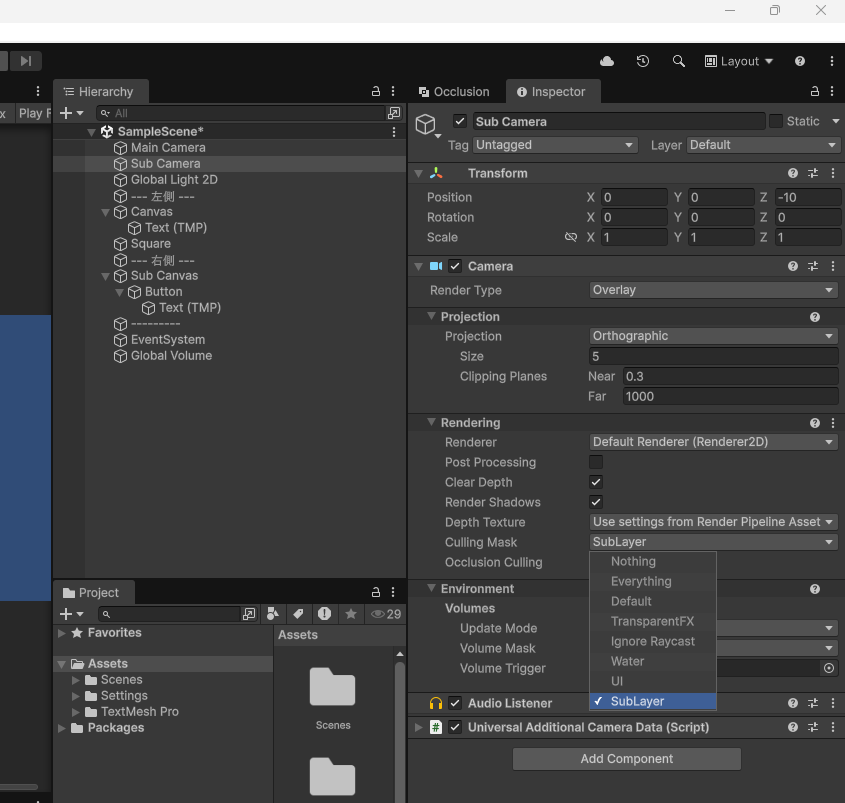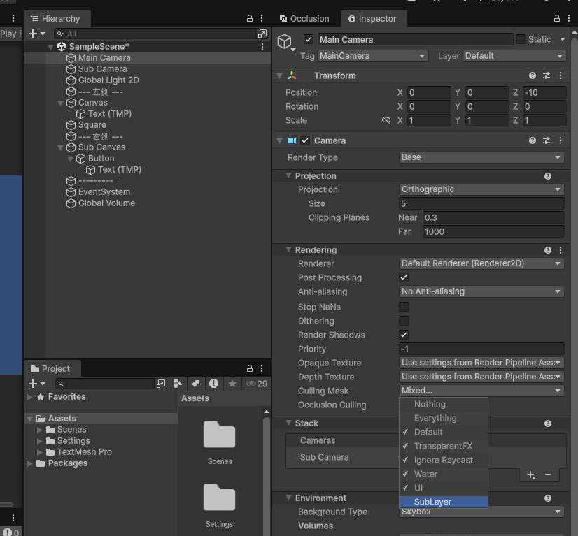 Main Cameraを選択し、Camera > Rendering > Culling Maskのセレクトボックスから、SubLayerのチェックだけを外す