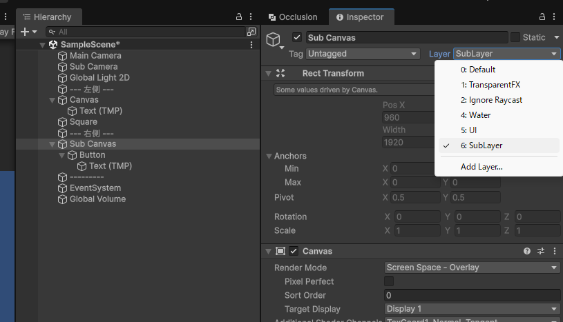 右側のゲームオブジェクト(Sub Canvas)のレイヤーをSubLayerにしてください(子オブジェクトも適用)。