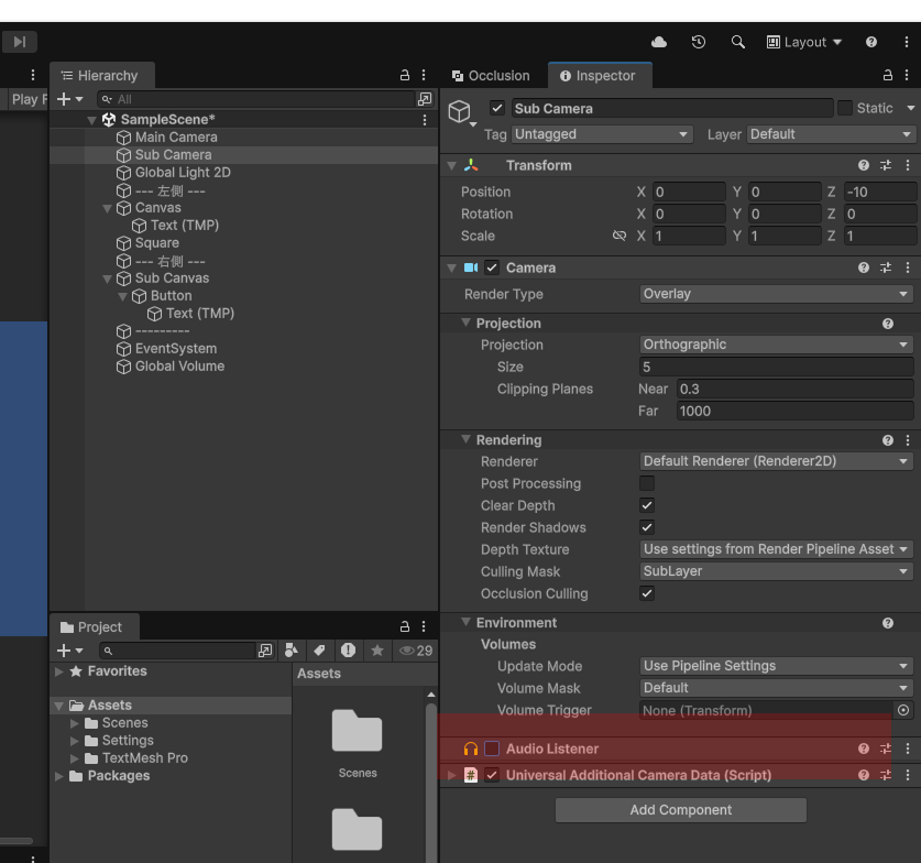 Sub CameraのAudio Listenerコンポーネントを無効にする