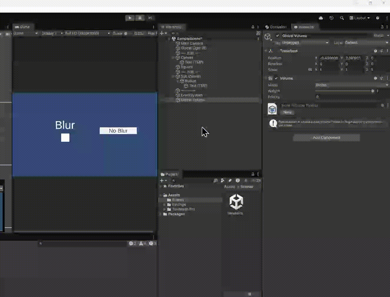 Hierarchyパネルで左クリックし、Volume > Global Volumeを選択してグローバルボリュームを作成してください。