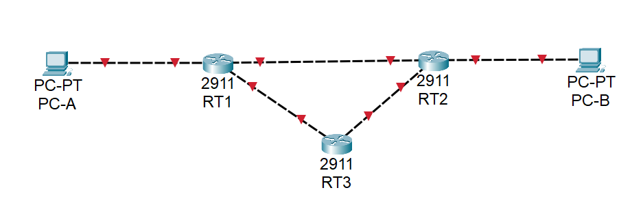 PC-A --- RT1 --- RT3 --- RT2 --- PC-B