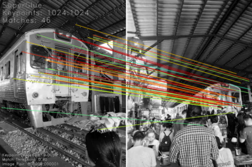 案件で、画像同士の特徴マッチングに関して調査していて面白かったSuperGlueのまとめ記事。特徴抽出は、SuperPointなどで行い、その後のマッチングにAttentionを導入して精度向上している。下の図が実際に試した結果。
