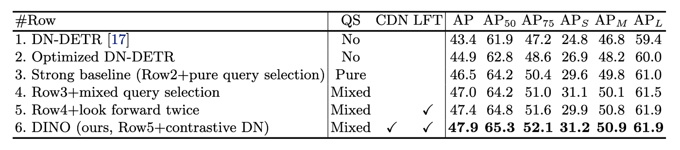 DETR系のモデルで、Denoising trainingによるContrastive法、アンカー初期化のための混合クエリー選択法、Box予測による2重先読み (look forward twice sheme)